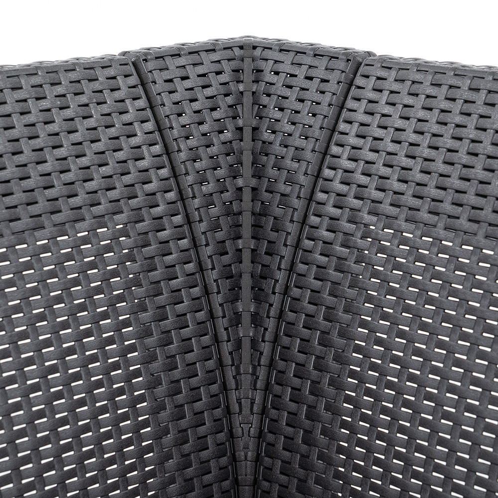 A garnitúra sima karfái, kényelmes háttámlái és a csomagban található puha párnák köszönhetően minden adott a kikapcsolódáshoz. Az elegáns grafit színű rattan hatású anyag nem csupán esztétikus, hanem rendkívül tartós és könnyen tisztítható is.