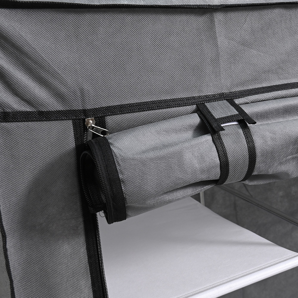 • Anyag: Tartós fémváz és magas minőségű poliészter szövetborítás, amely ellenáll a mindennapos használatnak, és megóvja a ruhákat a portól és szennyeződéstől. A fém szerkezetet műanyag rögzítőelemek erősítik meg, biztosítva a szekrény stabilitását.