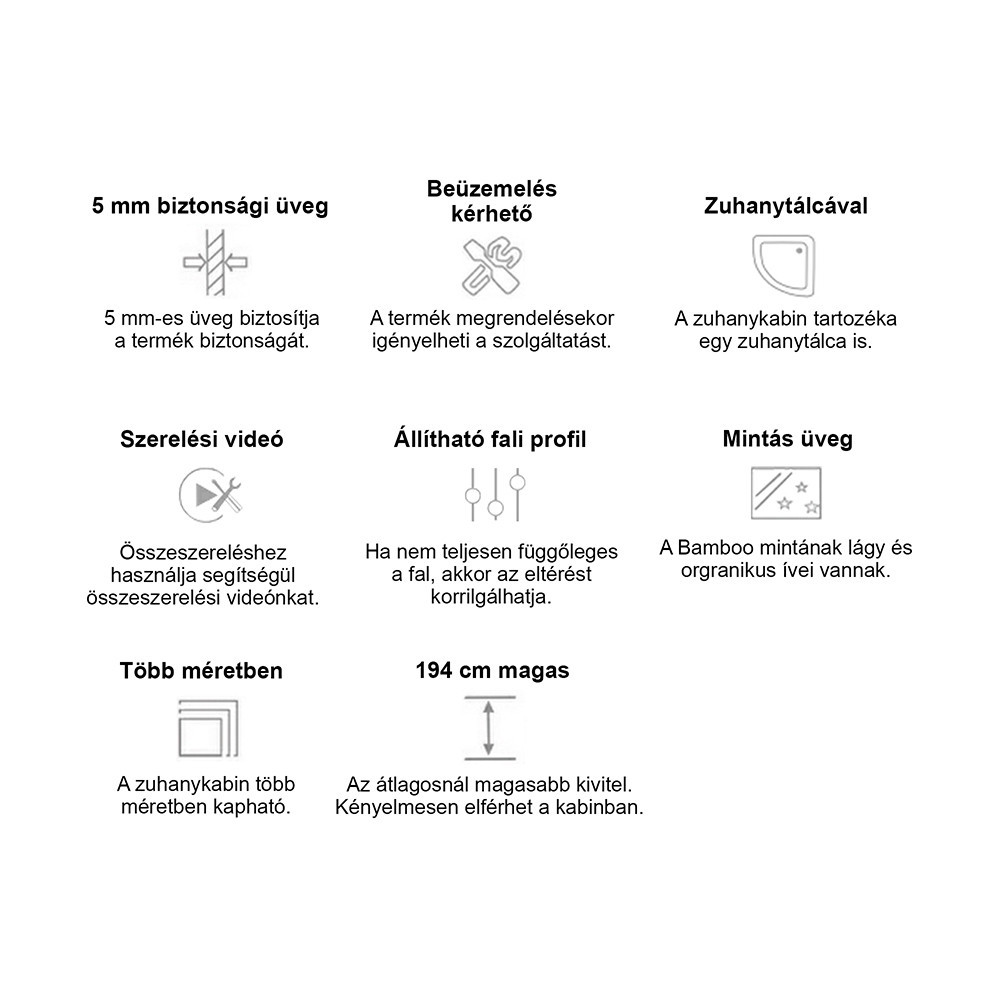 • Magasság: 180 cm (kabin), 194 cm zuhanytálcával együtt
